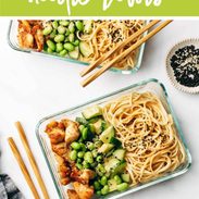 - Bowls: Divide noodles, edamame, cucumber, and chicken into containers. Drizzle with a little extra sauce and sprinkle with sesame seeds. Voila! Store in the fridge for 3-4 days. Eat hot or cold. Take a shot for the ‘gram cause this is your moment.