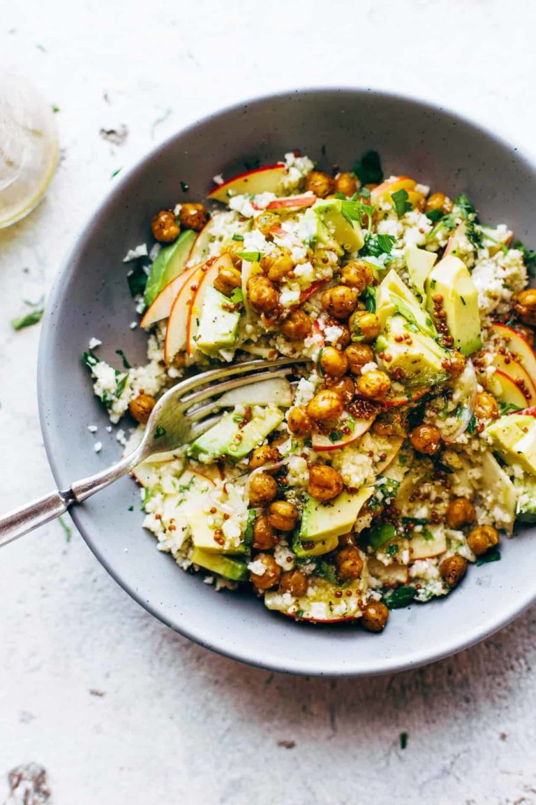 An herby, fresh vegan power salad featuring cauliflower, apples, shallots, roasted spiced chickpeas, and a quick grainy mustard dressing.