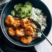 Close-up of chipotle orange shrimp in a bowl with rice and cucumbers