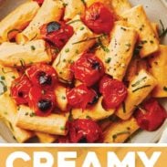 This Creamy Vegan Red Pepper Pasta is seriously delicious and seriously vegan! Perfectly chewy rigatoni, blistered juicy tomatoes, a creamy-but-cream-less roasted red pepper sauce, all sprinkled with fresh chives and basil.