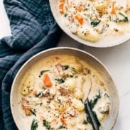 If I don’t just *happen* to have some fresh homemade gnocchi laying around (which hello, like, NEVER HAPPENS, because homemade gnocchi disappears in five seconds flat around here), then store-bought gnocchi it is. Those savory fluffy little bites of airy perfection cook up just right when stirred in at the end of cook time for this soup.