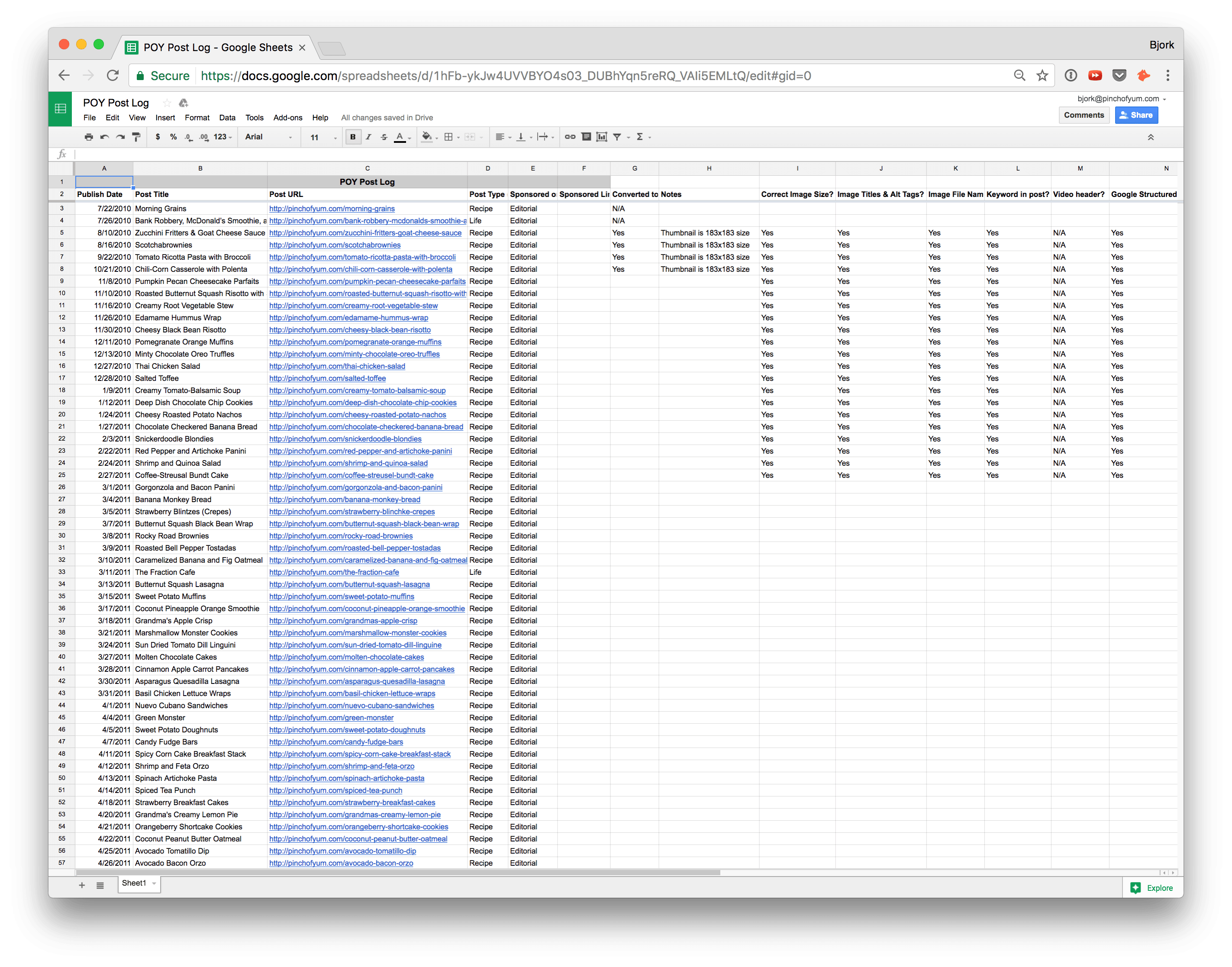 To start, we created an entire post log of Pinch of Yum content in a spreadsheet – recording the publish date, post title, URL, category, and whether it was sponsored or editorial. This is the starting point that we’re working from, and now, we’re implementing the checklist we created to ensure all these posts are as optimized as possible for search.