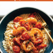 Shrimp laced with buttery garlic and thyme and a burst tomato sauce served on a creamy Parmesan orzo.