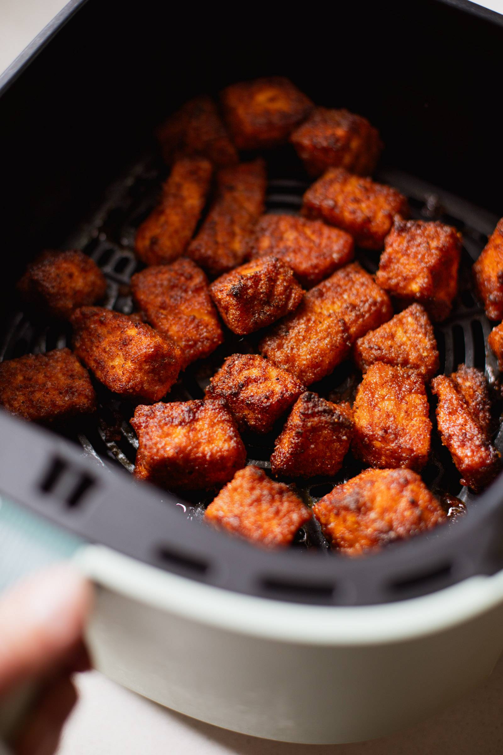 - Place your salmon pieces in the air fryer (I just dump them right in) and spread them out a bit so they’re not laying all over each other. Air fry at 400 degrees for 8 minutes!