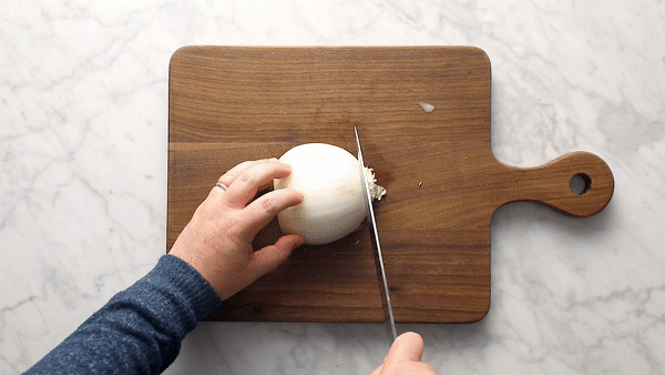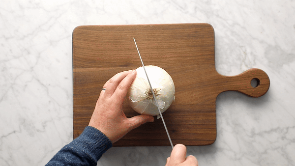 - Cut in half. Turn the onion upright on one of the flat ends and cut it down the middle.