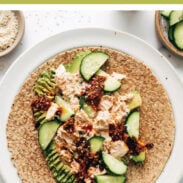 Creamy, crunchy, tangy! It’s a Kimchi Tuna Salad Wrap! Packed with tuna, kewpie mayo, kimchi, avocado, cucumbers, and a bit of chili crisp – all snuggled into a wrap. So, so good!