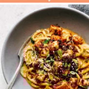 Spicy Sesame Zoodles with Crispy Tofu! SUPER easy recipe with familiar ingredients β soy sauce, peanut butter, sesame oil, garlic, zucchini, and tofu. Vegan / Vegetarian