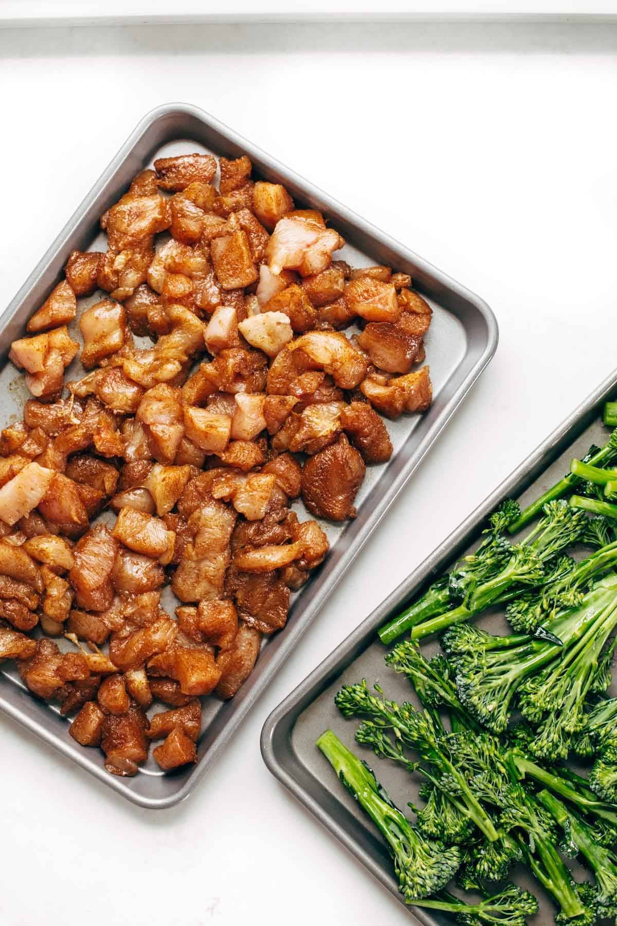 Load up your sheet pans with the chicken, broccolini, and sweet potatoes. Bake!