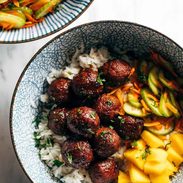 - Assemble: Serve meatballs over rice with a scoop of the pickled veggies, mango, and a handful of cilantro. Spoon a little bit of extra sauce over the top. SO GOOD.